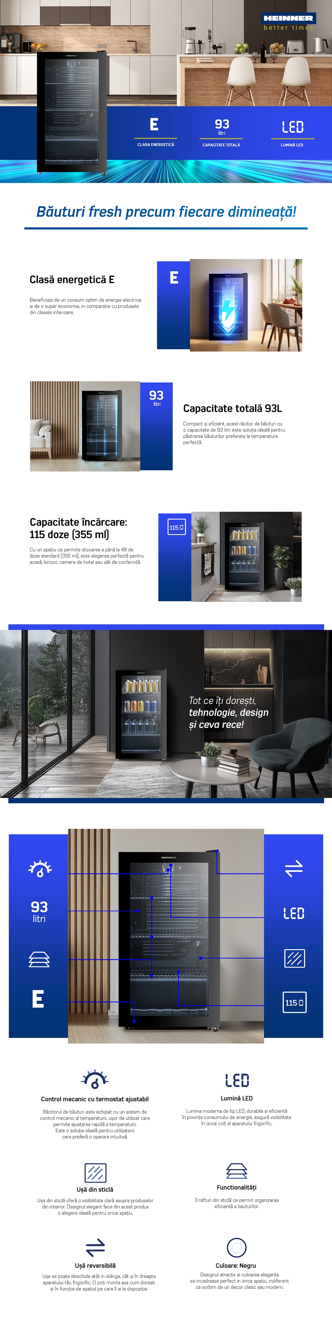 Opiniile clientilor despre Racitor de bauturi Heinner HBC-M93BKE, clasa E, capacitate 93L, capacitate incarcare: 115 doze (355 ml, iluminare LED, 3 rafturi, usa reversibila, Negru